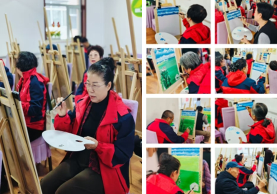 活动中,轻松有趣的热身互动使得现场氛围暖意融融,授课老师用通俗易懂的语言搭配生动的油画作品展示,带领大家直观感受油画的独特魅力。细致讲解绘画工具的用法与安全注意事项,手把手指导基础技巧,贴心消除了绘画“零基础”老人们的顾虑。老人们围坐画架前,在专业老师的耐心指导下,一步步勾勒轮廓、铺陈底色、点缀细节。大家时而低头专注创作,时而轻声交流绘画心得,脸上满是认真与惬意,原本空白的画纸上,渐渐绽放出绚烂的色彩,每一笔都饱含着老人们对生活的热爱与对美好的期许。